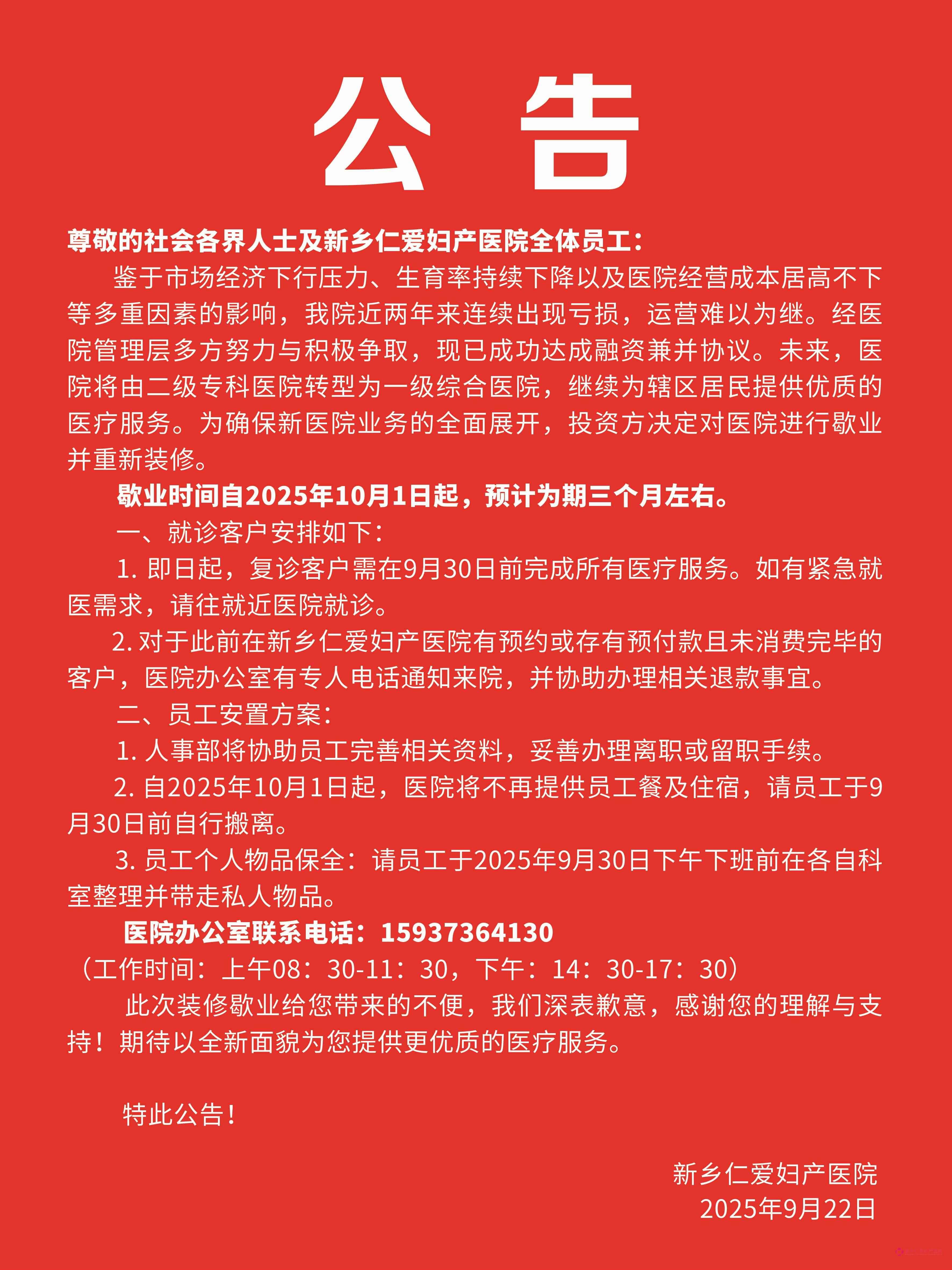 通知丨關于新鄉仁愛婦產醫院歇業的公告